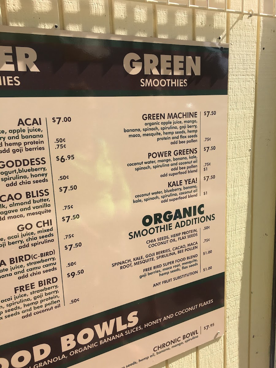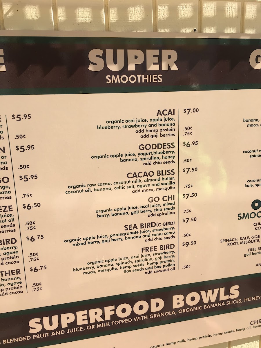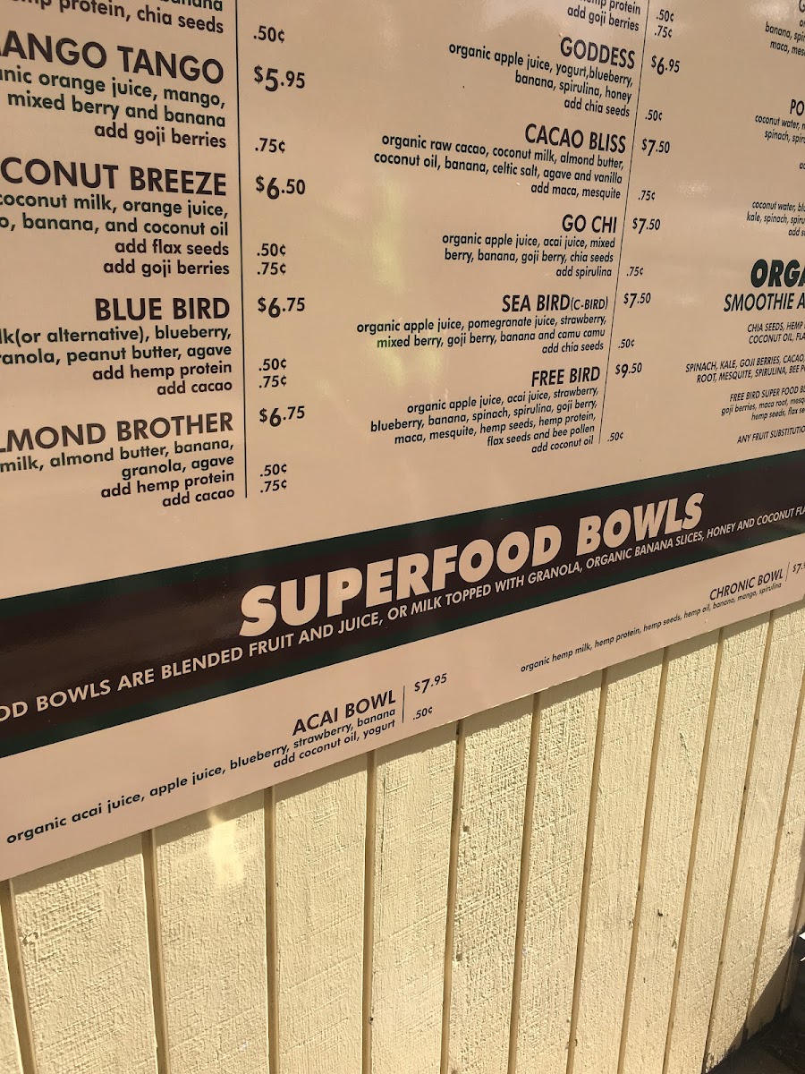 The menu is thoughtfully curated, offering a selection of delicious coffees and superfood bowls. Start your day with a Café Au Lait or an Iced Coffee, expertly crafted to satisfy both your caffeine cravings and taste buds. For a refreshing health boost, don't miss their Acai Bowl or Chronic Bowl, both bursting with vibrant flavors and nutrients. And for smoothie lovers, The Free Bird offers blended delights like Green Machine and Power Greens, perfect for a quick pick-me-up any time of the day.
